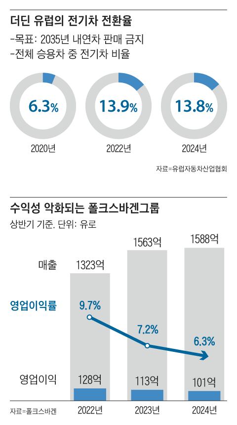 문제는 성과가 나타나지 않고 있다는 것이다. 유럽자동차산업협회에 따르면 올해 1~7월 유럽에서 팔린 전체 승용차 중 전기차 비율은 여전히 13.8%에 그친다. 2021년 10%를 처음 넘겼고, 작년 최고점(15.8%)을 찍은 뒤 오히려 뒷걸음치고 있다. 고전하는 유럽 자동차 기업의 모습은 실적에서 고스란히 드러난다. 폴크스바겐그룹의 영업이익률이 올 상반기(1~6월) 기준 6.3%였다. 2022년(9.7%)과 지난해(7.2%)에 이어 계속 감소하는 추세다. 경쟁력 있던 내연차 대신 전기차 전환을 시도했지만 전기차에서 손실이 발생하면서 수익에 악영향을 끼쳤다.
