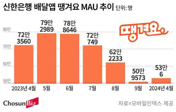 30일 빅데이터 분석 플랫폼 모바일인덱스에 따르면 신한은행 배달앱 땡겨요의 지난 4월 월간활성이용자수(MAU)는 53만6명으로 전년 동기(72만3560명)와 비교해 19만3554명 감소한 것으로 집계됐다. 1년 새 이용자 4분의 1이 줄어든 것이다. 같은 기간 배달의민족 MAU가 2174만명으로 땡겨요가 차지한 시장 점유율은 1.5% 수준이다.