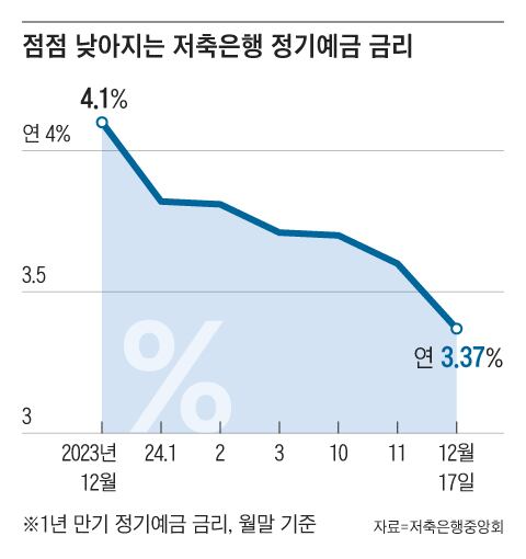 17일 저축은행중앙회에 따르면, 이달 기준 저축은행 79곳의 1년 만기 정기 예금 평균 금리는 연 3.37%다. 1년 전만 해도 연 4%를 훌쩍 넘었는데 1%포인트가량 낮아졌다. 이달 기준 가장 높은 이자를 지급하는 곳은 청주저축은행인데, 그래도 연 4%가 되지 않는다.
