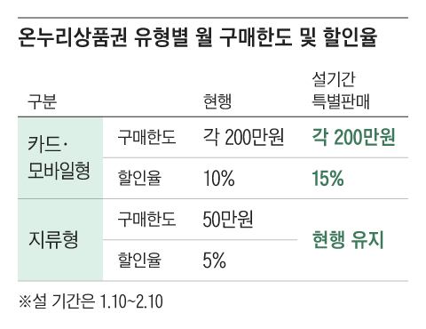 설 명절을 맞아 오는 10일부터 한 달간 디지털 온누리상품권의 할인율이 10%에서 15%로 오른다. 액면가 1만원짜리 상품권을 8500원에 살 수 있다는 뜻이다. 또 이 기간 디지털 온누리상품권 결제액의 최대 15%를 환급받을 수 있다.