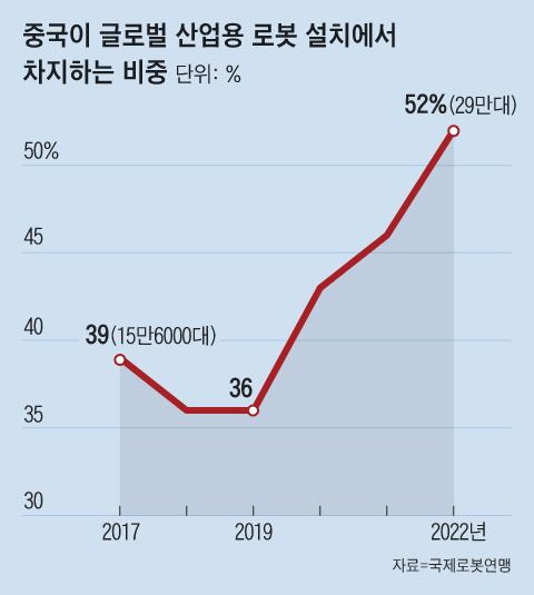 중국의 산업용 로봇 설치 증가세는 폭발적이다. 최근 전 세계 산업용 로봇의 과반이 중국에 설치된다. 국제로봇연맹(IFR)에 따르면, 지난 2022년 한 해 동안 중국에 총 29만258대의 산업용 로봇이 설치됐다. 이는 같은 해 전 세계에 설치된 산업용 로봇(55만3052대)의 약 52%에 이른다. 설치 대수를 기준으로 2위인 일본(5만413대)의 5.8배, 3위 미국(3만9576대)의 7.3배 수준에 이르는 수치다.