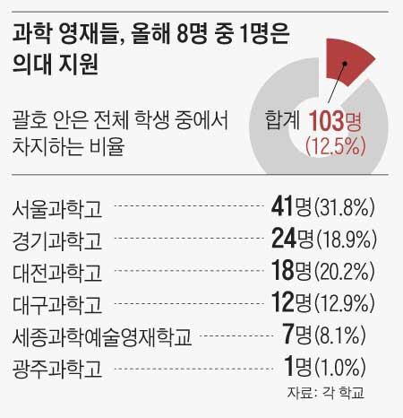 다른 영재학교도 사정은 비슷하다. 본지가 전국 영재학교 8곳 2023학년도 의대 지원 현황을 조사했더니 3학년 821명 중 103명(12.5%)이 의대에 원서를 쓴 것으로 집계됐다. 8명 중 1명꼴이다. 지난해 14.1%보다는 약간 줄었지만 영재고에 부는 의대 열풍이 사그라들지 않고 있는 것이다. 서울과학고는 3학년 129명 가운데 41명(31.8%)이 의대에 지원했고, 대전과학고 16명(20.2%), 대구과학고 12명(12.9%) 등도 의대행(行)을 택했다.