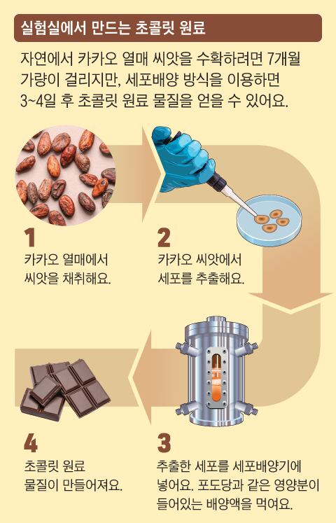 사람들은 카카오 나무가 없어지지 않도록 기후 위기를 해결해야 한다고 촉구하고 있어요. 동시에 카카오 나무가 멸종할 때를 대비해 새로운 아이디어도 나왔어요. 과학기술을 이용해 카카오 열매 대신 쓸 수 있는 초콜릿 원료 물질을 직접 만들어 보자는 것이죠. 미국 식품 기업 ‘캘리포니아 컬처드’가 실험실에서 초콜릿 원료를 생산하는 방법을 개발했답니다. 바로 ‘세포 배양 방식’이에요.