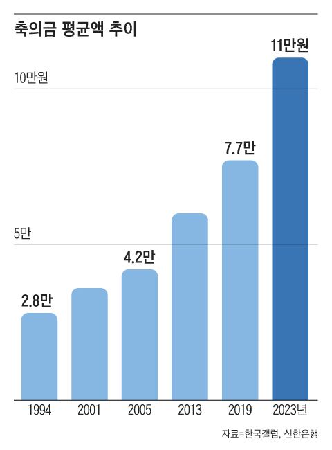 한국갤럽 조사에 따르면, 축의금 평균 금액은 1994년 2.8만원, 2001년 3.6만원, 2005년 4.2만원, 2013년 6만원, 2019년 7.7만원 순으로 점진적 증가세를 보여왔다. 물가가 반영돼 있다. 요즘엔 어떨까? 지난해 KB국민카드 설문 조사(400명)에서는 친한 친구나 직장 동료 축의금은 평균 17만원, 4촌 이상 친척은 평균 26만원이라는 응답이 나왔다. 지난 4월 신한은행이 발표한 설문 조사(1만명) 결과에서는 평균 11만원이었다. 식장에 참석하지 않고 봉투만 보낼 경우엔 8만원. 예식 장소가 호텔이라면 축의금은 평균 12만원으로 올라갔다. 20만원을 낸다고 응답한 비율이 15.6%에 달했다. 비싼 호텔 밥값을 고려한 것이다. 지갑 사정이 여의치 않은 경우 ‘식충이’ 취급을 받지 않으려 돈만 보내는 경우도 적지 않다.