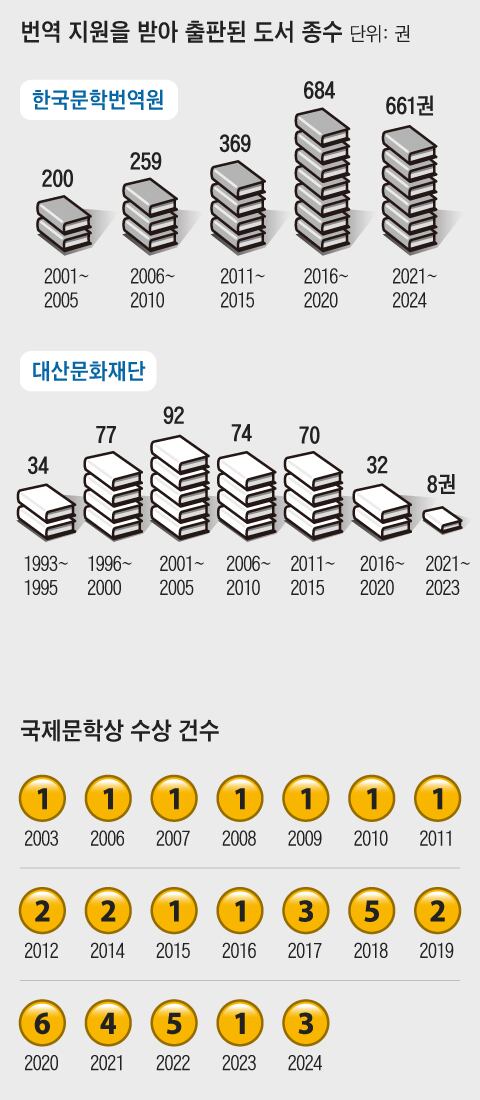 일본 작가 가와바타 야스나리에 이어 오에 겐자부로까지 연거푸 노벨 문학상을 받자 “우리도 문학 세계화에 도전하자”는 여론이 일었다. 1992년 대산 신용호 교보생명 설립자의 출연으로 대산문화재단이 탄생했다. 이듬해 김원일 소설 ‘마당 깊은 집’ 등 5권을 영어와 불어로 출간했다. 2001년엔 한국문학번역원이 가세했다. 국내 작품의 해외 번역 출판은 이 두 기관 중심으로 이뤄지고 있다.