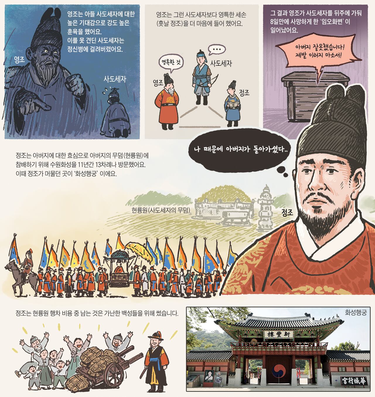 정조가 이토록 극진한 효심으로 아버지를 그리워했던 이유는 무엇이었을까요? 정조는 아버지 사도세자의 죽음에 대해 ‘나 때문에 아버지께서 돌아가셨다’는 죄책감과 안타까운 마음을 갖고 있었다고 해요. 세손이 그토록 영특하지 않았다면 할아버지가 아들 대신 손자를 선택하지는 않았을 것이니 말입니다. ‘정조 평전’을 쓴 한영우 서울대 명예교수는 “(아버지의 죽음 때문에 갖게 된)유소년기 정조의 트라우마(정신적 상처)는 할아버지 영조에게 받은 가르침 덕분에 임금이 된 뒤 좋은 정치에 애쓰는 긍정적인 원천이 됐다”고 평가합니다.