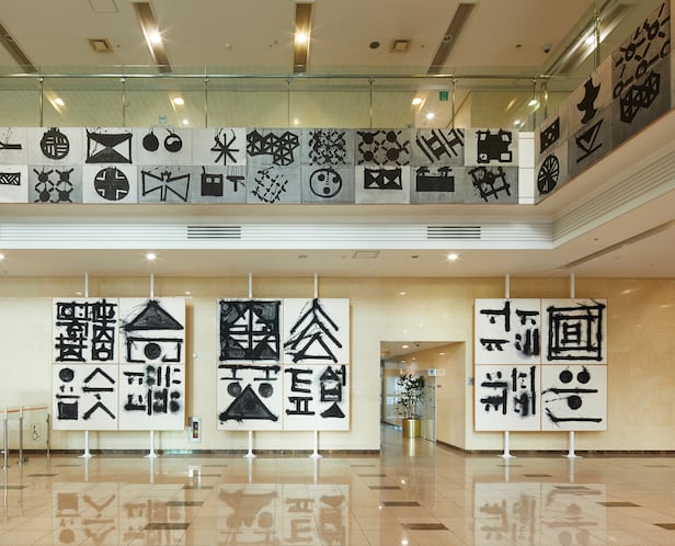 한국거래소가 전시장으로 변신했다. 서울 여의도 한국거래소 로비 등지에서 화가 김혜련(58)씨의 개인전 ‘그림을 쓰다: 훈민정음’을 열고 그림 100여 점을 28일까지 선보인다. 우리 고대 문양과 훈민정음을 재해석한 연작으로, 난간·벽면 등을 전시 장소로 적극 끌어들여 회화의 건축적 설치를 노렸다. 한국거래소 측은 “고유의 독자적인 길을 개척해야 선진국과 어깨를 나란히 할 수 있다”며 “이번 전시에서 선보이는 낯설고 새로운 조형미가 그 가능성을 보여줄 것”이라고 했다.