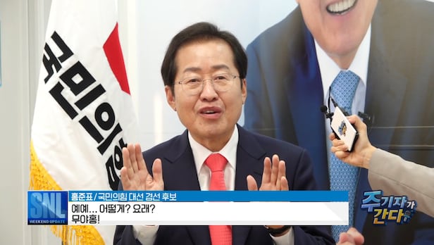 국민의힘 대선 주자인 홍준표 의원이 23일 SNL코리아 ‘인턴 기자’ 코너에 출연해 “경선은 ‘무야홍(무조건 야권 후보는 홍준표)’으로 될 것이고, 본선은 ‘무대홍(무조건 대통령은 홍준표)’으로 해보려고 한다”고 말했다. 홍 의원은 이날 공개된 OTT(온라인 영상 제공 서비스) 업체 쿠팡플레이 코미디 프로그램 SNL코리아에서 ‘인턴 기자’ 역할을 맡은 배우 주현영(25)과 나눈 인터뷰에서 이같이 말했다.