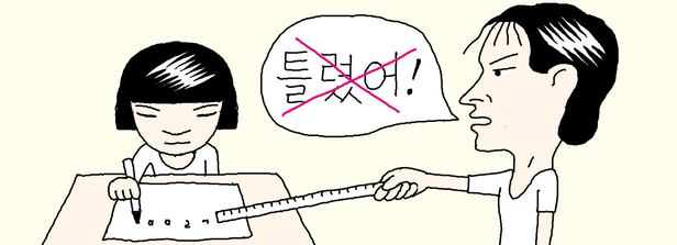 한창 한글을 배우기 시작한 아이가 있었어요. 아이는 어떤 글자를 아는데도 실수로 여러 번 틀렸습니다. 부모는 아이가 그 글자를 틀릴 때마다 아이의 손을 자로 때렸어요. 아이는 한글을 배우기 싫어졌어요.
