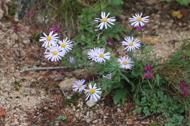 과연 산길에 들어서자마자 개쑥부쟁이가 연보라색 꽃을 피우며 반기고 있었다. 개쑥부쟁이는 사람들이 들국화라 부르는 종류 중 하나로 가장 흔하게 볼 수 있는 쑥부쟁이 종류다. 쑥부쟁이와 달리, 꽃을 감싸는 총포가 어지럽게 펼쳐져 있어서 어렵지 않게 구분할 수 있다.