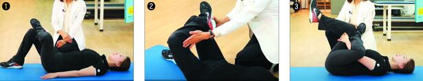 바닥에 등을 대고 누운 뒤 무릎이 직각이 되도록 다리를 세운다. 먼저 왼쪽 다리를 들어 올려 왼쪽 발목을 오른쪽 무릎 위에 올려 준다<그림①>. 왼쪽 무릎도 직각이 되도록 모양을 잡는다<그림②>. 오른쪽 다리를 살짝 올려 허벅지 밑으로 양손을 넣어 감싸 안 듯 잡는다. 천천히 허벅지를 가슴 쪽으로 잡아 당긴다<그림③>. 이때 엉덩이가 따라 올라가지 않도록 하는 것이 중요하다. 몸이 한쪽으로 기울지 않도록 척추를 바닥에 곧게 붙인다. 최대한 당긴 상태에서 숨을 마쉬고 내쉬며 호흡한다. 반대쪽도 동일하게 한다. 이 동작을 하면 대부분은 엉덩이 안쪽 근육이 이완돼 시원한 느낌을 받는다. 하지만 통증이 심하다면 동작을 반복하며 당기는 범위를 서서히 늘려가는 것이 좋다.