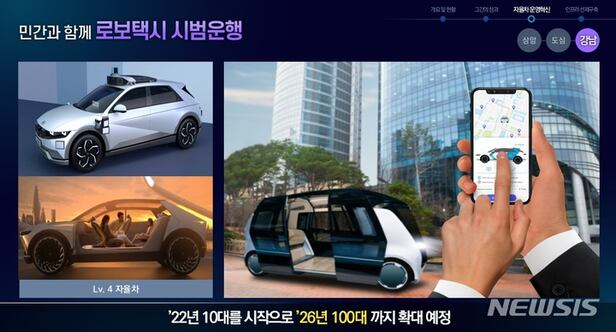 내년 초 강남 일대를 시범운행지구로 지정해 민간과 함께 '로보택시(무인 자율주행택시)' 10대 이상을 운행한다. 2026년에는 자율주행버스와 로보택시 등을 100대 이상으로 늘린다. 강남 지역의 경우 3㎞ 이내 단거리 이동 수요가 많은 만큼 셔틀버스 등을 전기 자율차로 대체하는 방안도 검토 중이다.