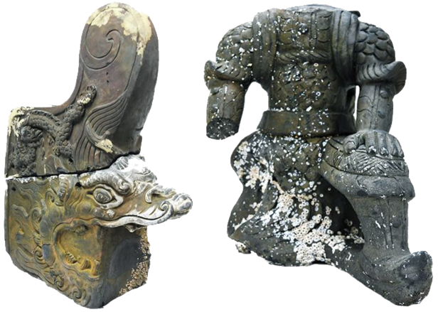 문화재청 국립해양문화재연구소는 충남 태안 청포대해수욕장 갯벌에서 조선 전기 용머리 모양의 대형 왕실 장식 기와(사진 왼쪽·높이 103㎝)와 갑옷을 입은 사람 모양의 장수상(오른쪽·높이 30㎝)을 발굴했다고 19일 밝혔다. 조선 전기의 취두(鷲頭·용마루의 양쪽 끝에 올리는 용머리 모양의 장식 기와)가 온전한 모습으로 발굴된 것은 처음이다. 서울에서 제작된 장식 기와를 삼남(충청·전라·경상도)의 왕실 건물에 쓰기 위해 운반하던 중 태안 해역에서 침몰했을 것으로 추정된다.