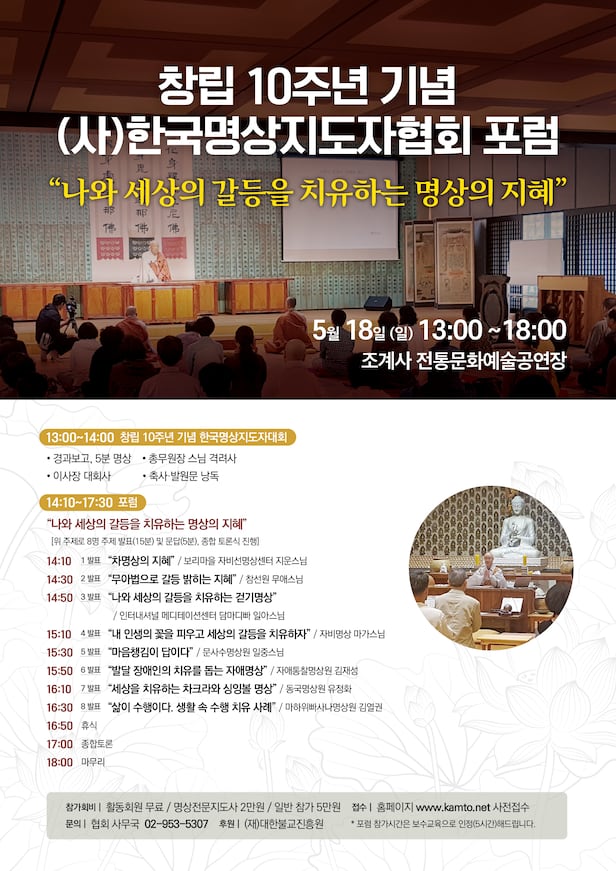 포럼의 주제는 ‘나와 세상의 갈등을 치유하는 명상의 지혜’. 참선원 무애 스님, 인터내셔널 메디테이션센터 담마디빠 일아 스님, 자비명상 마가 스님, 문사수명상원 일중 스님, 자애통찰명상원 김재성 대표, 동국명상원 유정화 원장, 마하위빠사나명상원 김열권 원장, 보리마을 자비선명상센터 이현주씨 등 전문가 8명이 발표자로 나서 차(茶) 명상, 싱잉볼 명상, 걷기 명상 등 다양한 명상법을 소개한다.