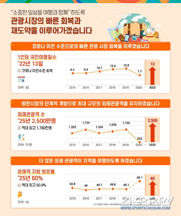 문화체육관광부 황 희 장관은 "업계 피해 지원과 시장 활성화로 우선 시급한 국내 관광을 회복하고, 방한 관광도 단계적으로 정상화해 나가겠다"며 "오는 2025년에는 외래관광객 2500만 명을 유치하고, 관광객들이 서울만이 아닌 전국 곳곳을 여행할 수 있도록 한국 관광의 매력을 키워나가겠다"라고 밝혔다↓.신보순 기자 bsshin@sportschosun.com