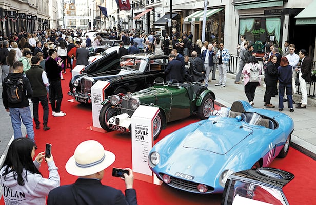 25일(현지 시각) 영화 킹스맨의 배경이 된 영국 런던의 고급 양복점 거리 세빌 로(Savile Row)에서 관람객들이 전시된 클래식 카를 살펴보고 있다. 24~25일 고급 양복점과 자동차 업계의 협업으로 진행되는 축제인 ‘세빌 로 콩쿠르(Concours on Savile Row)’에서는 1967년형 메르세데스-벤츠 600, 1966년 출시된 람보르기니 400GT와 같은 클래식 카뿐 아니라 최신 전기차까지 40여 대가 전시됐다. 이 기간 동안 이 거리에는 차량 통행이 금지되고, 거리에 있는 유명 양복점들과 아트 갤러리가 관람객들에게 개방된다.