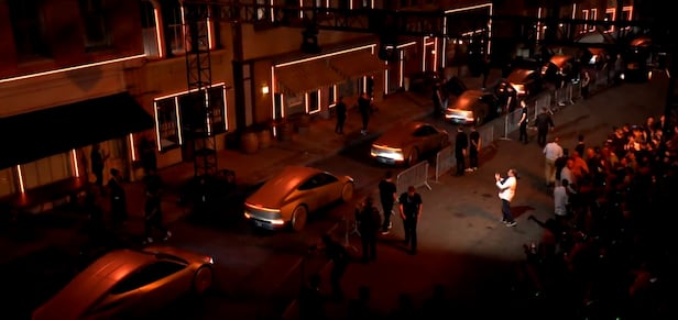테슬라가 10일(현지 시각) 미국 캘리포니아 로스앤젤레스 워너브러더스 영화 촬영 스튜디오에서 진행한 로보 택시 ‘사이버캡’ 공사 행사에 시제품들이 한줄로 나란히 서 있는 모습. 완전 자율 주행 차량으로, 실내에 운전대와 페달이 없다. /테슬라