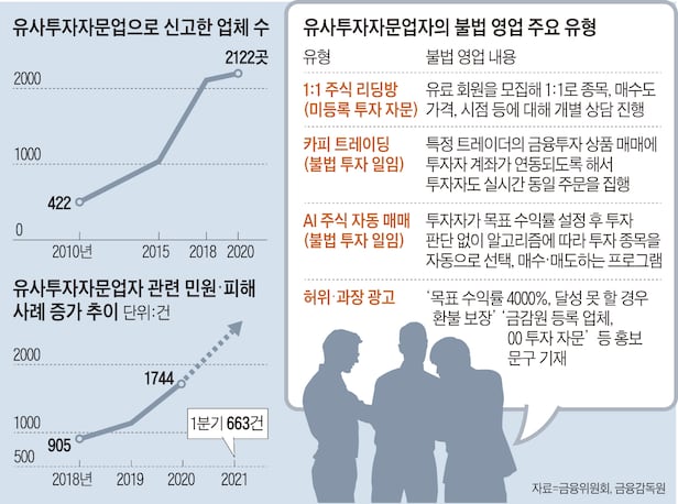 금융감독원에 따르면 유사투자자문업체로 당국에 신고한 업체 수는 2015년 959곳에서 지난해 2122곳으로 매년 급증하고 있다. 업체 수가 늘어나면서 관련 민원과 피해도 급증하고 있다. 금감원에 접수된 관련 민원만 2018년 905건에서 지난해 1744건으로 늘었다.