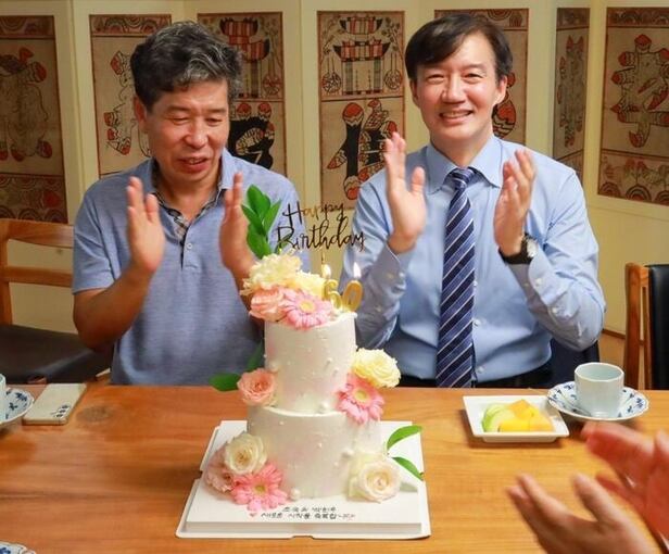 공개된 사진을 보면 조 전 대표와 백 전 비서관은 케이크 앞에서 손뼉을 치며 웃고 있었다. 케이크에는 ‘조국&백원우, 새로운 시작을 축복합니다’라는 문구가 새겨져 있었으며, 숫자 초 ‘60’도 꽂혀 있었다.
