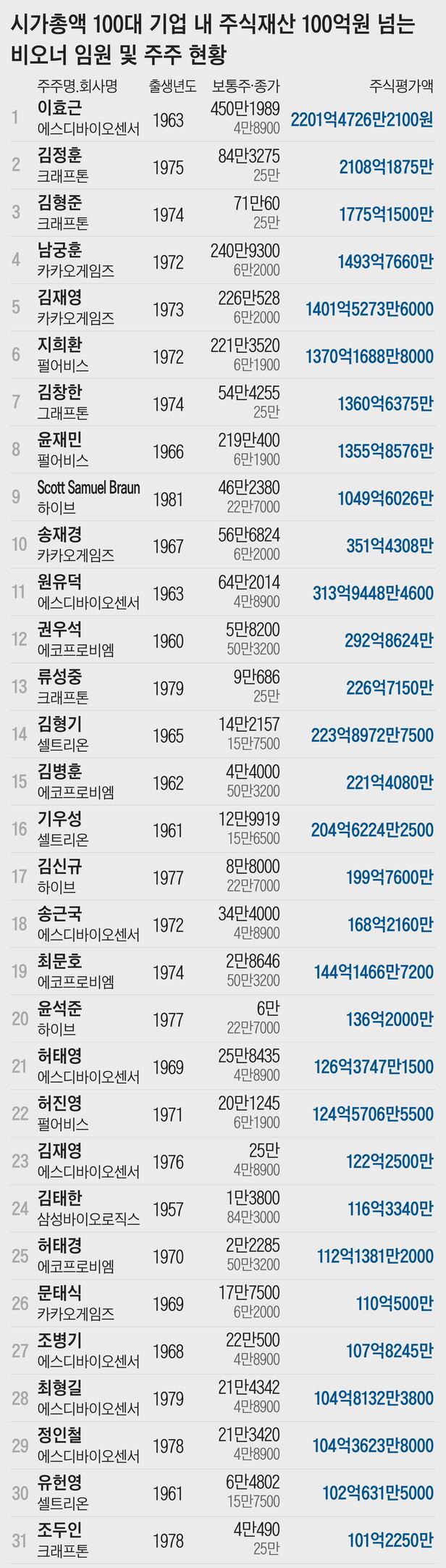 주식 재산이 가장 많은 임원은 에스디바이오센서의 이효근 대표이사로 2201억원을 보유하고 있다. 2위는 크래프톤 계열사 라이징웍스의 김정훈 대표로 2108억원을 보유하고 있고, 3위는 크래프톤 자회사 블루홀스튜디오의 김형준 사내이사로 1775억원을 보유하고 있다. 4위인 남궁훈 카카오 대표이사는 1493억원을, 5위인 카카오 계열사 라이온하트스튜디오의 김재영 대표이사는 1401억원을 보유했다.