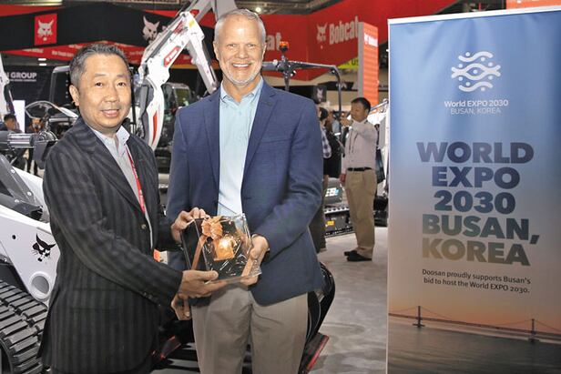박 회장은 이 자리에서 두산밥캣 북미 지역의 마이크 볼웨버 지역장 등 임직원들에게 ‘2023 두산 경영대상’도 시상했다. 두산 경영대상은 연간 경영 실적을 평가해 최고의 성과를 거둔 사업 부문에 수여한다. 두산밥캣은 작년 글로벌 공급망 리스크, 국제 정세 불안 등 힘든 환경에서도 매출 8조6219억원, 영업이익 1조716억원으로 최대 실적을 거뒀다. 두산밥캣 관계자는 “북미 시장에서 고성장을 달성한 GME(농업·조경 장비)을 앞세워 유럽을 비롯한 다른 지역 시장을 적극적으로 공략해 나갈 것”이라고 했다.
