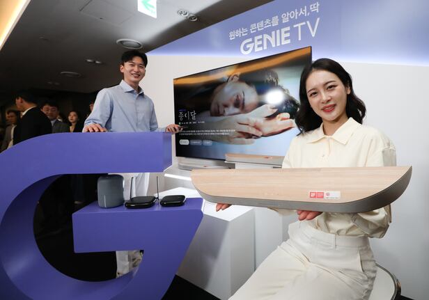 18일 서울 동대문구 노보텔에서 열린 ‘KT그룹 미디어데이’에서 여성 모델이 IPTV 셋톱박스와 무선인터넷 공유기, AI 스피커를 하나로 통합한 ‘지니TV 올인원 셋톱박스(STB)’를 두 손에 들고 소개하고 있다. 차세대 고화질 기술인 ‘돌비비전’과 ‘HDR10+’를 동시 지원할 뿐 아니라, 세계적 산업 디자이너 스테파노 조반노니가 외형을 디자인한 제품이다. 또 KT는 이날 행사에서 내년까지 오리지널 드라마 30여 편을 선보이는 등 미디어 부문 연 매출을 2025년까지 5조원 달성하겠다는 계획도 발표했다.