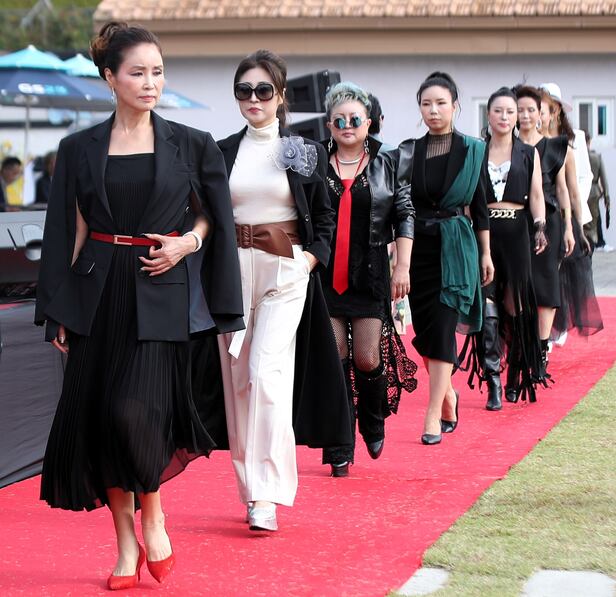17일 부산광역시 부산진구 부산시민공원에서 중년들의 인생 2막을 응원하는 ‘2024 부산 50+ 일자리 박람회’가 열린 가운데, 시니어 모델 패션쇼에 참가한 중년 여성들이 ‘모델 워킹’을 선보이고 있다. 이날 패션쇼에는 부산과학기술대학교에서 운영 중인 ‘부산시 50+ 생애 재설계 대학’ 수강생 50여 명이 참여했다. 부산시가 주최하는 이번 박람회에선 50세 이상을 위한 채용 상담회가 운전·운송, 판매·서비스, 경비·환경·미화, 기계·생산·건축 분야에서 마련된다.