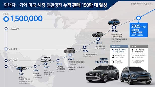 현대차·기아는 2011년 미국 친환경차 시장 진출 이후 11년 만인 2022년 누적 판매 50만대를 돌파했고, 2년 뒤인 2024년에는 100만대, 지난달에는 150만대라는 대기록을 달성했다.
