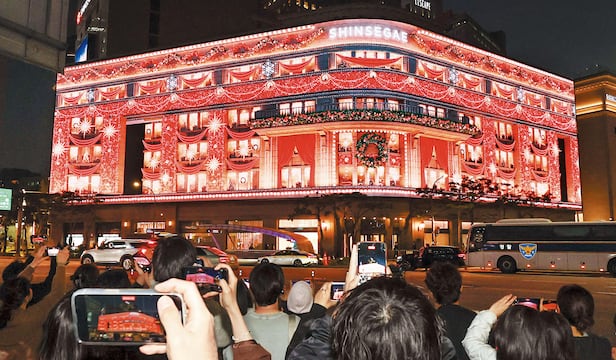 7일 오후 서울 중구 신세계백화점 본점 외벽에 설치된 초대형 미디어 파사드 ‘신세계스퀘어’에 크리스마스 영상이 공개됐다. 오가는 시민들이 걸음을 멈추고 영상을 지켜보고 촬영했다. ‘시간을 잇는 마법의 세계’라는 주제로 3분가량 선보이는 이 영상은 매일 오후 5시부터 자정까지 볼 수 있다. 영상의 음악은 체코 필하모닉 오케스트라 단원 60여 명이 크리스마스 캐럴과 베토벤 교향곡 5번을 모티브로 재해석한 연주를 체코 드보르자크 홀에서 녹음했다.