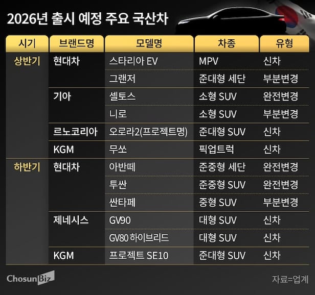 1일 자동차업계에 따르면 한국자동차모빌리티산업협회(KAMA)는 ‘2025년 자동차 산업 평가 및 2026년 전망’ 보고서를 통해 올해 국내 완성차 브랜드가 페이스리프트(부분변경) 모델을 포함해 총 16종의 신차를 출시할 것이라고 전망했다. 지난해 10종의 신차가 나온 것과 비교하면 6종이 늘어나는 것이다.