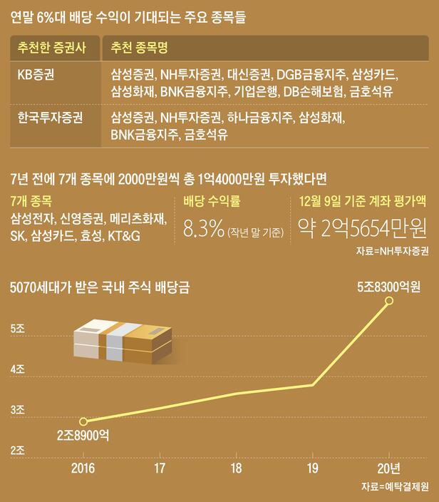 투자자 B씨의 7년 전 배당주 투자 포트폴리오를 NH투자증권이 계산해 봤다. 총 1억4000만원을 삼성전자, 신영증권, 메리츠화재, SK, 삼성카드, 효성, KT&G 등 7종목에 2000만원씩 투자했다. 7년을 기다린 B씨가 챙긴 작년 배당 수익률은 8.3%. 배당뿐만 아니라 주식 투자 수익률도 83%에 달해 계좌 평가액은 약 2억5600만원(배당금 제외)으로 커졌다.