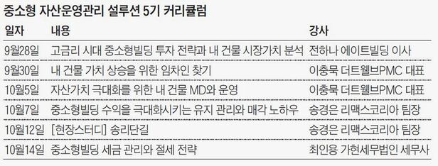 땅집고는 중소형 빌딩 건물주 대상으로 ‘중소형빌딩 자산운영관리 설루션’ 5기 과정을 개설한다. 건물 임대 수익률과 매각 가치를 극대화하고 싶은 건물주라면 반드시 알아야 할 노하우와 전략을 알려준다. 오는 28일부터 10월14일까지 매주 수·금요일 총 6회로 진행하며 현장 스터디 1회를 포함한다.