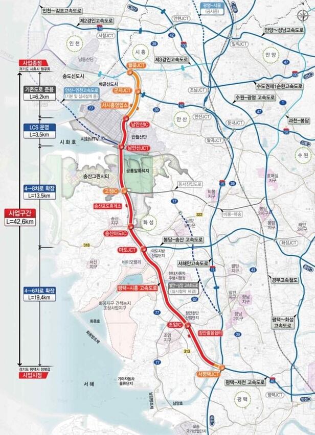 현재 왕복 4차로로 운영 중인 평택–시흥 고속도로는 이번 사업을 통해 6~8차로로 확장된다. 서평택JCT(분기점)에서 마도JCT까지는 6차로로, 마도JCT에서 남안산JCT까지는 8차로로 각각 확장되며 공사 기간은 60개월이 소요될 예정이다.