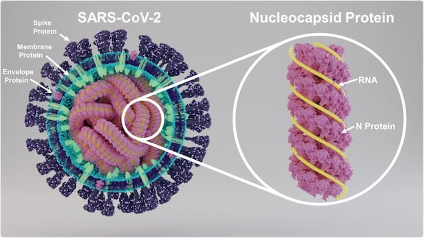코로나 바이러스는 밖에는 돌기처럼 돋은 스파이크 단백질이 있고, 껍질은 막 단백질과 외피 단백질로 구성된다. 그 안쪽에는 유전물질인 RNA와 이를 둘러싼 단백질 껍질(캡시드)이 결합된 뉴클레오캡시드가 있다.