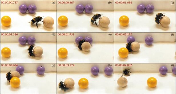 연구진은 먹이가 있는 곳으로 연결되는 통로 양쪽 빈 공간에 18개의 나무 공을 배치했다. 벌이 먹이를 향해 곧바로 가는지, 주변의 공을 가지고 노는지 살펴보기 위한 실험을 매일 3시간에 걸쳐 18일 동안 했다. 이 실험 대상은 45마리 벌이었는데 많게는 117회나 공을 굴린 벌도 있었다. 연구진은 “보상이 없는데도 자발적으로 공을 굴리는 것은 그것을 즐긴다는 의미”라고 했다.