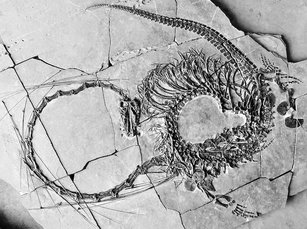 사진 왼쪽에 가시 면류관처럼 동그랗게 말려 있는 부분이 목이다. 목이 전체 몸 길이(약 6m)의 절반이 넘을 정도로 길어 스코틀랜드 네스호(湖)에 산다(?)는 ‘괴물’을 연상시킨다. 스코틀랜드 국립박물관 측은 이번 연구 성과를 공개하면서 “디노세팔로사우루스는 네스호의 괴물 신화에 영감을 준 ‘플레시오사우루스’와는 관련이 없다”며 선을 그었다. 목이 긴 수장룡(首長龍)으로 불리는 플레시오사우루스는 약 2억년 전 동물로, 디노세팔로사우루스보다 4000만년 후에 등장했다는 것이다.
