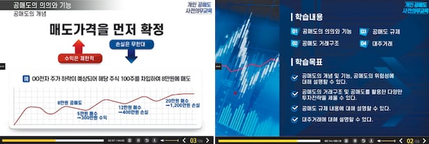 공매도 사전 교육은 금융투자협회의 ‘금융투자교육원’ 홈페이지에서 들을 수 있다. 공매도의 개념부터 증시에 미치는 영향, 개인 투자자가 주의할 점 등을 담은 동영상을 약 30분 정도 시청하면 된다. 지난 20일부터 시작된 사전 교육에는 27일 오전까지 8000명이 넘는 개인 투자자가 참여했다. 공매도는 주식을 빌려서 판 다음 나중에 다시 사서 갚는 매매 기법이다. 주가가 내려가야 수익이 나는데, 주가가 급등하면 큰 손실을 볼 수 있다.