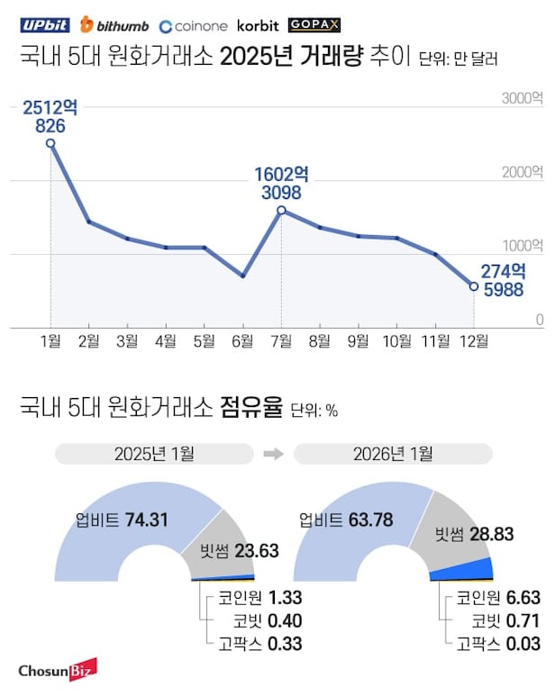 코스피가 4700을 돌파하며 호황을 맞은 가운데, 가상 자산(코인) 시장은 거래 절벽에서 벗어나지 못하고 있다. 작년 초 도널드 트럼프 미국 대통령이 취임한 후 가상 자산 시장은 호황을 맞았으나 이후 거래량이 줄면서 약 10분의 1로 줄었다.