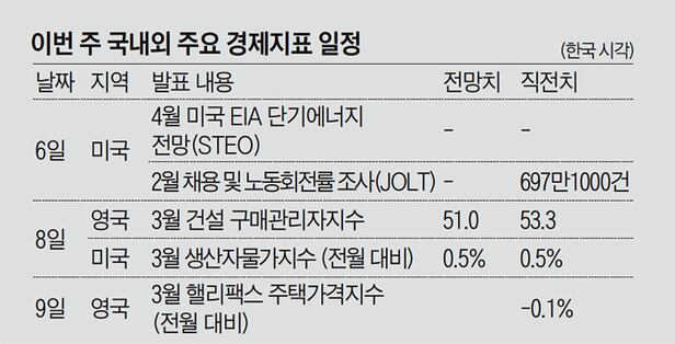 미국 노동부가 6일 채용 및 노동 회전률 조사(JOLT) 보고서를 발표한다. 최근 신규 채용과 이직으로 창출된 고용 건수를 알 수 있다. 이 건수는 작년 5월(499만건)부터 꾸준히 늘어 고용 회복 기조가 뚜렷하다. 1년 전인 2020년 4월(601만건)을 뛰어넘어 연간 최고치를 기록할 것으로 기대된다. 미국 에너지정보청(EIA)은 6일 ‘단기에너지전망’을 발표한다. 하루 평균 원유 생산량 증가 전망이 이어질지 시장의 관심이 쏠린다. 9일 영국에선 핼리팩스 주택가격지수가 발표된다. 지난해 하반기 집값이 크게 오른 영국에선 새해 들어 잠시 상승세가 주춤한 뒤 숨 고르기에 들어간 모양새다. 핼리팩스 지수는 2월 -0.4%로 크게 떨어졌다가, 3월 -0.1%로 곧장 반등했다. 당분간 0%대 변동 흐름이 지속할 것으로 예상된다.
