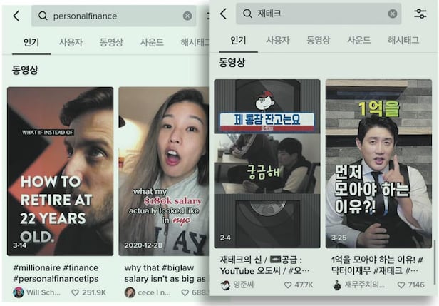 틱톡의 교육 콘텐츠 격인 #LearnOnTikTok(틱톡에서 배워요) 해시태그(hashtag·검색 주제어)가 붙은 동영상의 누적 조회 수는 26일 기준 908억회에 달한다. 이 중 #personalfinance(재테크) 동영상은 누적 조회 수 41억회, #investing(투자하기) 영상의 조회 수는 22억회다. 한국어 #재테크, #주식, #저축노하우, #금융 해시태그 영상들도 최근 누적 조회 수 7000만회를 넘겼다. 주로 투자 종목을 직접 추천해주는 영상이 많다. 구독자 수 15만명으로 ‘투자 인플루언서’ 반열에 오른 틱토커(tiktoker·틱톡 크리에이터) 크립토진(CryptoZin)은 가상 화폐 투자에 대한 내용을 주로 다룬다. 경제 관념이 아직 부족한 Z세대를 겨냥해 신용카드 빚 갚기나 경제적으로 자립하기 등 기본적인 내용를 다루는 콘텐츠도 많다. 어려운 경제 용어나 투자 상품에 대한 개념을 쉽게 이해시키기 위해 일부 틱톡커들은 자신의 수입과 지출, 빚, 세금 내역은 물론 세세한 투자 포트폴리오를 공개하고, 일인다역 상황극을 하기도 한다.
