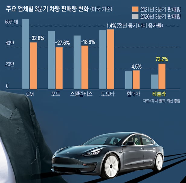테슬라와 달리 일반 자동차 업체들은 반도체 부족 여파에 여전히 고통받고 있다. GM은 3분기 미국 내에서 44만6997대를 팔아 전년 동기 대비 21만8195대(32.8%) 줄었다. 2009년 파산 사태 이후 분기 기준으로는 최소치다. GM은 올 초 반도체 공급난이 불거진 이후 생산 기간이 짧은 트럭과 SUV를 우선시하고 더 오래 걸리는 모델은 생산을 중단하는 등 탄력 생산을 시행했다. 일부 모델에서 자동 시동 온·오프 기능을 빼는 등 조치도 취했다. 하지만 아직 효과는 크지 않다.