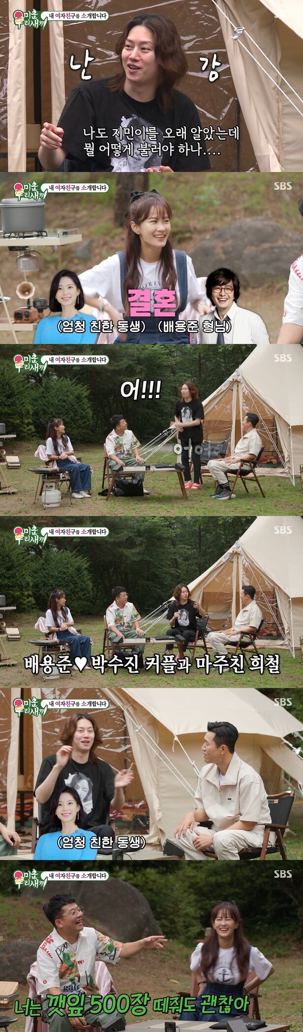 그러면서 "내가 예전에 박수진하고 엄청 친한 사이여서 놀러다니고 그랬는데 (박수진이) 어느 날 배용준 형님과 결혼을 한 거다"라며 "용준이형과 수진이 같이 만났는데 수진이가 '어 오빠?'하는데 내가 '어?'하다가 어색하게 대했던 기억이 난다"라고 했다.