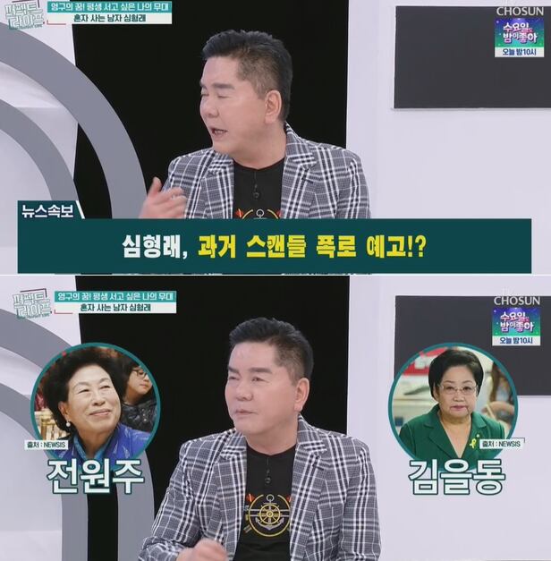 특히 심형래는 "외롭지 않으려고 그렇게 일을 하시냐"는 물음엔 "당연히 외로울 때도 있다"면서 "나도 옛날에 여자 탤런트랑 스캔들 난 거 얘기하면 지금 드라마들이 마비된다. 내가 발표하는 순간 그 분들은 방송에 못 나온다"라고 욱하는 모습을 보였다.