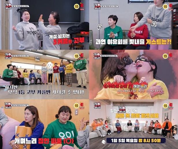 오늘(5일) 방송되는 티캐스트 E채널 예능 프로그램 ‘개며느리’(연출 박소현, 작가 안용진) 8회 예고에는 신년 맞이 고부 단합대회를 개최하는 고부들의 모습이 공개됐다. 방송으로 만나던 어머니들이 드디어 한자리에 모인 것.