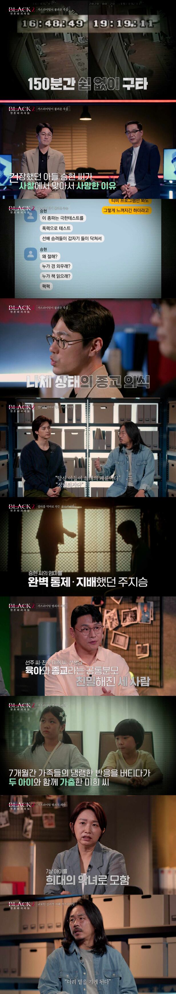 주로 늦은 밤과 새벽에 이어진 추궁과 비난은 승현 씨로 하여금 자신이 희대의 패륜아이며, 부모님과 절에서 몇 천만 원을 뜯어내려 했다는 등 가짜 고백이 담긴 자필 자술서를 쓰게 만들었다. 자극적인 범죄 고백마다 지장을 찍은 이상한 자술서들이었지만, 승현 씨의 어머니는 이 내용을 믿었다. 승현 씨의 어머니는 나체 상태로 절에서 종교의식을 할 만큼 이곳에 대한 믿음이 가득했다. 이 '종교의식'에 대해 알고 충격을 받은 승현 씨는 탈출을 꿈꿨으나 안타깝게도 죽기 전날까지 자술서를 작성했다.