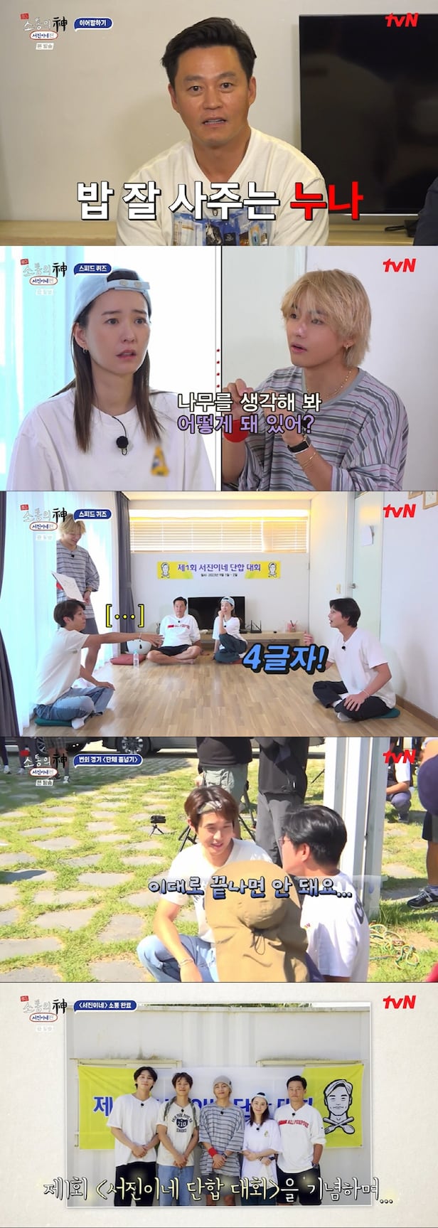 지난 19일 방송된 tvN '출장 소통의 신-서진이네 편' 2회에서는 사장 이서진, 이사 정유미, 부장 박서준, 인턴 최우식과 방탄소년단 뷔가 저녁이 걸린 이어말하기 게임, 특별 상여로 상품권이 제공되는 스피드 퀴즈, 제작진과 회식비 결제의 주인공을 가리는 체육대회까지 다채롭게 즐겼다.
