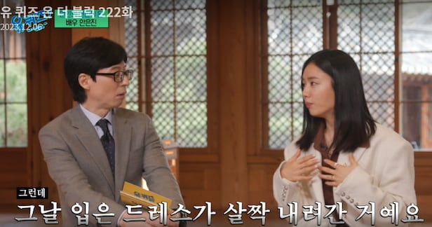 안은진은 청룡영화상 시상식에서 1억 원에 달하는 오프 숄더 드레스를 입고 레드카펫에 섰지만 드레스가 살짝 흘러내려 속옷이 잠깐 조금 노출되는 해프닝을 겪었다. 그는 "그날 하루가 스펙터클했다. 사진 찍힐 때 너무 떨리는데 그날 입은 드레스가 살짝 내려갔다. 말하려니까 부끄럽다. 주변에서 다들 걱정하길래 얘기하고 싶었다"라며 "당황했지만 살면서 그럴 수도 있는 거 아닌가. '어떡해' 이러고 들어가서 하니랑 눈 마주치고 회복했다"고 회상했다.