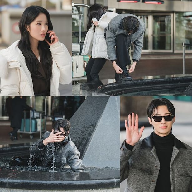 반면 류선재는 대한민국 최정상 스타로 넘사벽 포스를 뽐내고 있는 가운데 또 다른 스틸에 류선재의 물 폭탄 굴욕이 담겨 시선을 강탈한다. 이는 류선재가 분수대 난간에 다리를 올려놓은 채 구두끈을 묶다가 웃픈 봉변을 당한 것.
