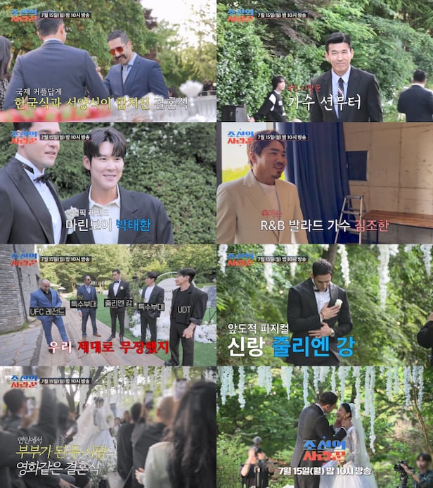이어 초호화 하객 군단도 공개됐다. 국민 사랑꾼 가수 션부터 격투기 레전드 '코리안 좀비' 정찬성, 수영 스타인 '마린보이' 박태환에 R&B 발라드 가수 김조한까지 셀럽들이 총출동했다. 여기에 '피지컬 넘사벽' 줄리엔강 못지않게 남다른 포스의 하객들도 포착됐다. 줄리엔강의 형인 UFC레전드 데니스강은 물론, 캐나다 특수부대 스왓(SWAT) 팀 출신의 지인과 707 특수부대 출신 최영재, UDT 출신 에이전트 H 등이 찾아왔다.