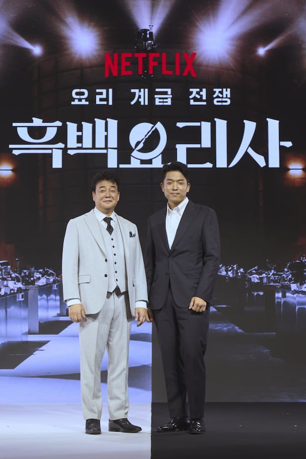 넷플릭스 새 오리지널 예능 시리즈 '흑백요리사: 요리 계급 전쟁' 제작발표회가 11일 오전 서울 종로구 JW메리어트동대문스퀘어서울에서 진행됐다. 행사에는 김학민 PD, 김은지 PD와 백종원, 안성재 심사위원이 참석했다.